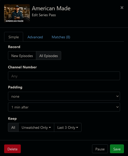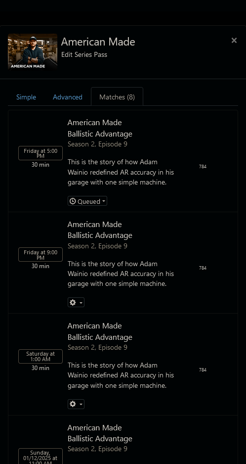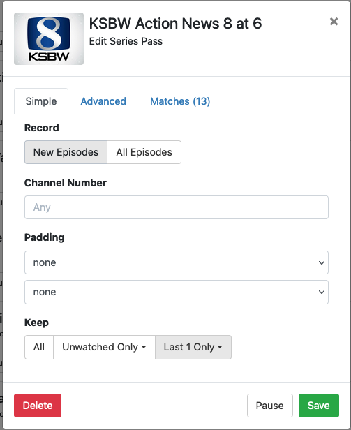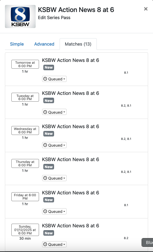 Any ideas why this is happening? Why would channel 8.1 be ignored if "any channel" is selected? Is there another way to be sure that I get this broadcast recorded? I could make 2 passes, one for channel 8.1 specifically, and one for channel 8.2 specificallly, but then wouldn't I get two recordings if the news show is on both channels 8.1 and 8.2?
