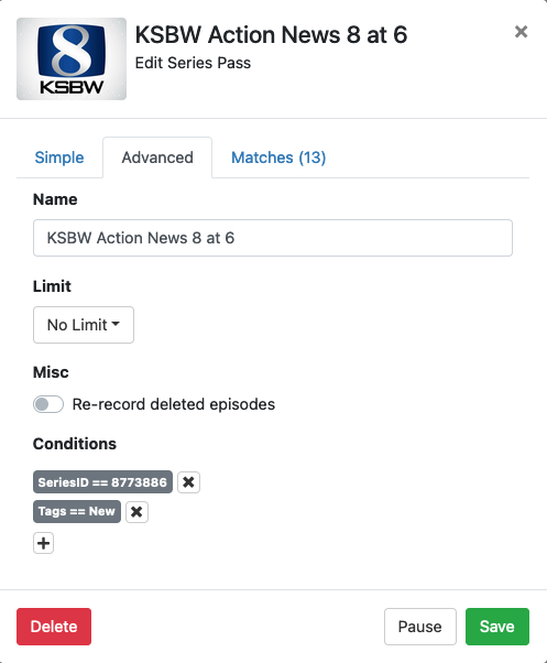 This problem is a little hard to describe, much less categorize. I have an HDhomerun Flex Quatro, which I'm using with Apple TV's. Trying to record a news show, "news at 6PM" kind of thing. Both the local NBC and ABC stations are owned by the same group here. NBC is channel 8.1, and ABC is channel 8.2. The exact same news show is broadcast on both channels, but sometimes on one or the other if something is going on on one of them at 6PM, sometimes on both channels. I've set up the pass for recording this show to use "any channel". However, the program is only recorded if it's on channel 8.2 (ABC in this case). If it's on 8.1 only, because something else is on 8.2, then it isn't recorded. So I miss the show occasionally, when I really want to see it every day.