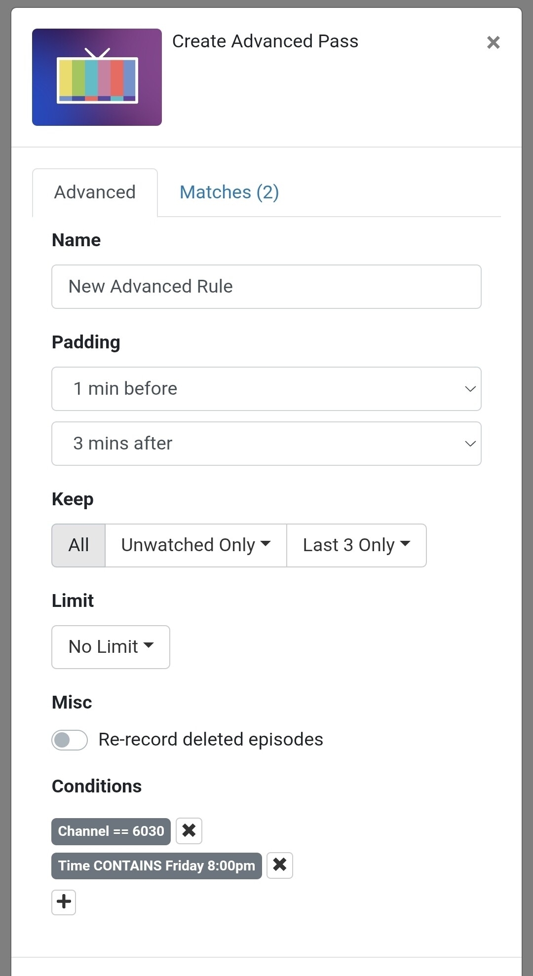 Is there a way to deal with timeslots that normally contain a program, but occasionally have a different program? For example, the Laura Cotes Live show is on at 8:00, and I have a pass for that. Today, CNN is showing "Missing: The Search For Nancy Guthrie" in that timeslot. It's still Laura Cotes, but it doesn't record because of the program metadata doesn't match the pass. I'd like to automatically record shows like that. I think this might be why recording a timeslot has been often requested. is there any other method?