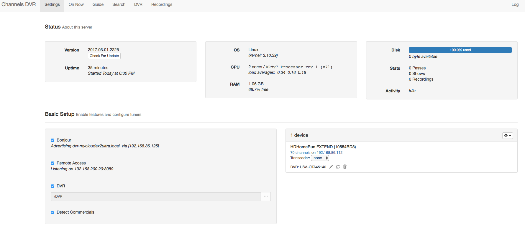Just getting my DVR set up for the first time using a brand new MyCloudEX2Ultra and I'm having issues. The DVR Web page (settings, etc.) is showing my disk use at 100 percent - even though I haven't recorded anything yet. I was having earlier with programs recordings, seeming to show as recorded but when I went to watch them I get the "spinny circle" for about 3-5 seconds and then it would revert back to the "watch" page without playing.