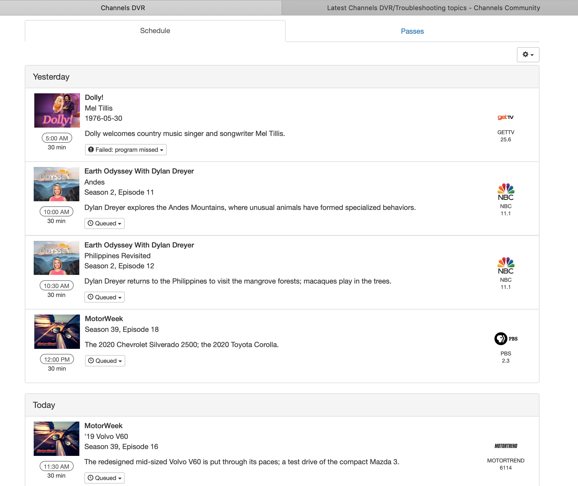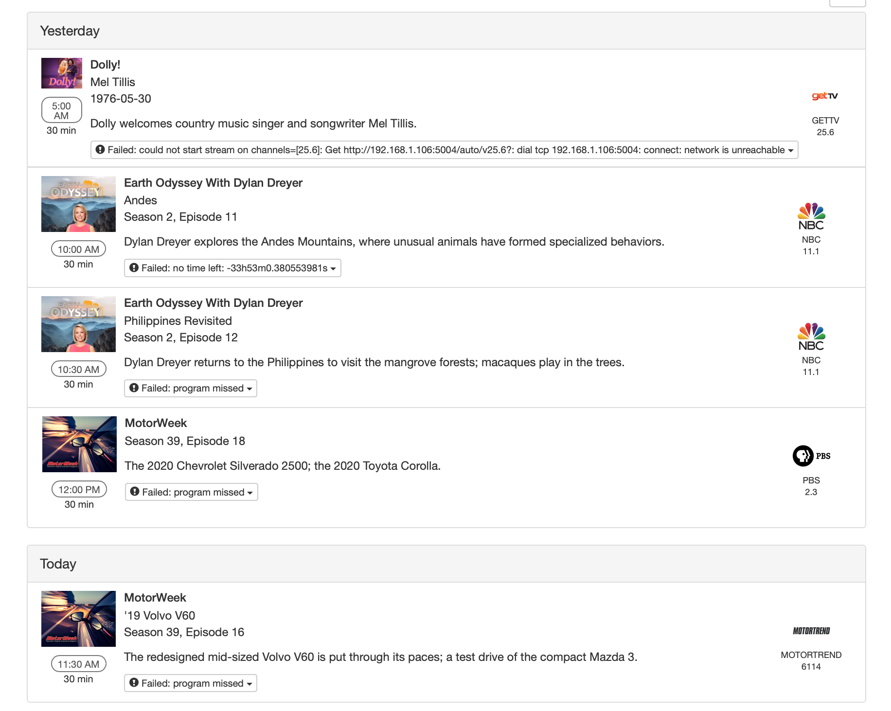 2020/01/04 05:00:00 [DVR] Starting job 1578135600-75 Dolly! on ch=[25.6] 2020/01/04 05:00:00 [DVR] Waiting 4h59m59.99551686s until next job 1578153600-77 Earth Odyssey With Dylan Dreyer 2020/01/04 09:14:00 [DVR] Fetching guide data for 34 stations in USA-OTA55437 @ 2020-01-04 9:00AM 2020/01/04 09:14:01 [DVR] indexed 257 airings (34 channels) [0s fetch, 0s index] 2020/01/04 09:14:01 [DVR] indexed 12 movies (6 channels) [0s fetch, 0s index] 2020/01/04 09:14:01 [DVR] pruned 31 replaced airings in 0s. -- snip 1 -- 2020/01/04 09:17:53 [DVR] Rule 'Batwoman' (73) found 1 new airings 2020/01/04 09:17:53 [DVR] queued recording job for EP032311020010 @ Sun Jan 19 7:00:00PM (1579482000-73) 2020/01/04 09:17:54 [DVR] Deleting job with expired serial: 1578798000-35 Saturday Night Live (EP000037101175) 2020/01/04 09:17:54 [DVR] Marking expired job 1578135600-75 Dolly! 2020/01/04 09:17:54 [DVR] Waiting 42m5.630700349s until next job 1578153600-77 Earth Odyssey With Dylan Dreyer 2020/01/04 09:17:56 [DVR] Waiting 42m3.742550113s until next job 1578153600-77 Earth Odyssey With Dylan Dreyer 2020/01/04 14:04:11 [SYS] Created database snapshot: backup-20200104.140411 2020/01/04 14:04:11 [SYS] Removing old backup backup-20191205.220740 -- snip 2 [ capturing dvr service reboot mentioned in next post ] -- 2020/01/05 20:23:00 [SYS] Shutting down... 2020/01/05 20:23:00 [TVE] action=screenshot_err err=context canceled 2020/01/05 20:23:00 [TVE] action=script_error err=&runtime.ExceptionDetails{ExceptionID:1, Text:"Uncaught", LineNumber:5, ColumnNumber:5, ScriptID:"15", URL:"", StackTrace:(*runtime.StackTrace)(0xc000eb4f40), Exception:(*runtime.RemoteObject)(0xc000c80090), ExecutionContextID:0} exp=&runtime.RemoteObject{Type:"string", Subtype:"", ClassName:"", Value:easyjson.RawMessage{0x22, 0x6e, 0x6f, 0x20, 0x6c, 0x6f, 0x67, 0x69, 0x6e, 0x20, 0x66, 0x6f, 0x72, 0x6d, 0x20, 0x66, 0x6f, 0x75, 0x6e, 0x64, 0x22}, UnserializableValue:"", Description:"", ObjectID:"", Preview:(*runtime.ObjectPreview)(nil), CustomPreview:(*runtime.CustomPreview)(nil)} exp_value="no login form found" 2020/01/05 20:23:00 [ERR] Could not start stream for TVE-Mediacom ch6030 CNN: TVE: encountered exception 'Uncaught' (5:5) 2020/01/05 20:23:00 [ERR] Failed to start stream on channel 25.6 via 107505AC: Get http://192.168.1.106:5004/auto/v25.6?: dial tcp 192.168.1.106:5004: connect: network is unreachable 2020/01/05 20:23:00 [DVR] Error running job 1578135600-75 Dolly!: could not start stream on channels=[25.6]: Get http://192.168.1.106:5004/auto/v25.6?: dial tcp 192.168.1.106:5004: connect: network is unreachable 2020/01/05 20:23:00 [DVR] Starting job 1578153600-77 Earth Odyssey With Dylan Dreyer on ch=[11.1] 2020/01/05 20:23:00 [DVR] Marking expired job 1578155400-77 Earth Odyssey With Dylan Dreyer 2020/01/05 20:23:00 [DVR] Error running job 1578153600-77 Earth Odyssey With Dylan Dreyer: no time left: -33h53m0.380553981s 2020/01/05 20:23:00 [DVR] Marking expired job 1578160800-23 MotorWeek 2020/01/05 20:23:00 [DVR] Marking expired job 1578245400-23 MotorWeek 2020/01/05 20:23:00 [DVR] Waiting 22h6m59.396154298s until next job 1578357000-59 Infinity Train 2020/01/05 20:23:01 [DVR] Waiting 22h6m58.497144713s until next job 1578357000-59 Infinity Train 2020/01/05 20:23:01 [DVR] Waiting 22h6m58.44542372s until next job 1578357000-59 Infinity Train 2020/01/05 20:23:03 [SYS] Bonjour service stopped. 2020/01/05 20:23:03 [DVR] Recording engine stopped. 2020/01/05 20:23:04 [SYS] Goodbye. 2020/01/05 20:23:07 [SYS] Starting Channels DVR v2019.12.05.0128 (freebsd-x86_64 pid:44061) in /usr/local/channels-dvr/data 2020/01/05 20:23:08 [HDR] Found 1 devices 2020/01/05 20:23:14 [SYS] Started HTTP Server 2020/01/05 20:23:14 [DVR] Recording engine started in /mnt/media/channels-dvr 2020/01/05 20:23:14 [SYS] Bonjour service running for dvr-channelsdvr.local. [192.168.1.152] 2020/01/05 20:23:14 [DVR] Waiting 22h6m45.061273764s until next job 1578357000-59 Infinity Train 2020/01/05 20:23:15 [SYS] Created database snapshot: backup-20200105.202315 2020/01/05 20:23:15 [SYS] Removing old backup backup-20191207.220742 2020/01/05 20:23:25 [IDX] Pruned 1249 expired airings from X-TVE in 126.545327ms. 2020/01/05 20:23:25 [IDX] Pruned 452 expired airings from USA-OTA55437 in 77.064582ms.