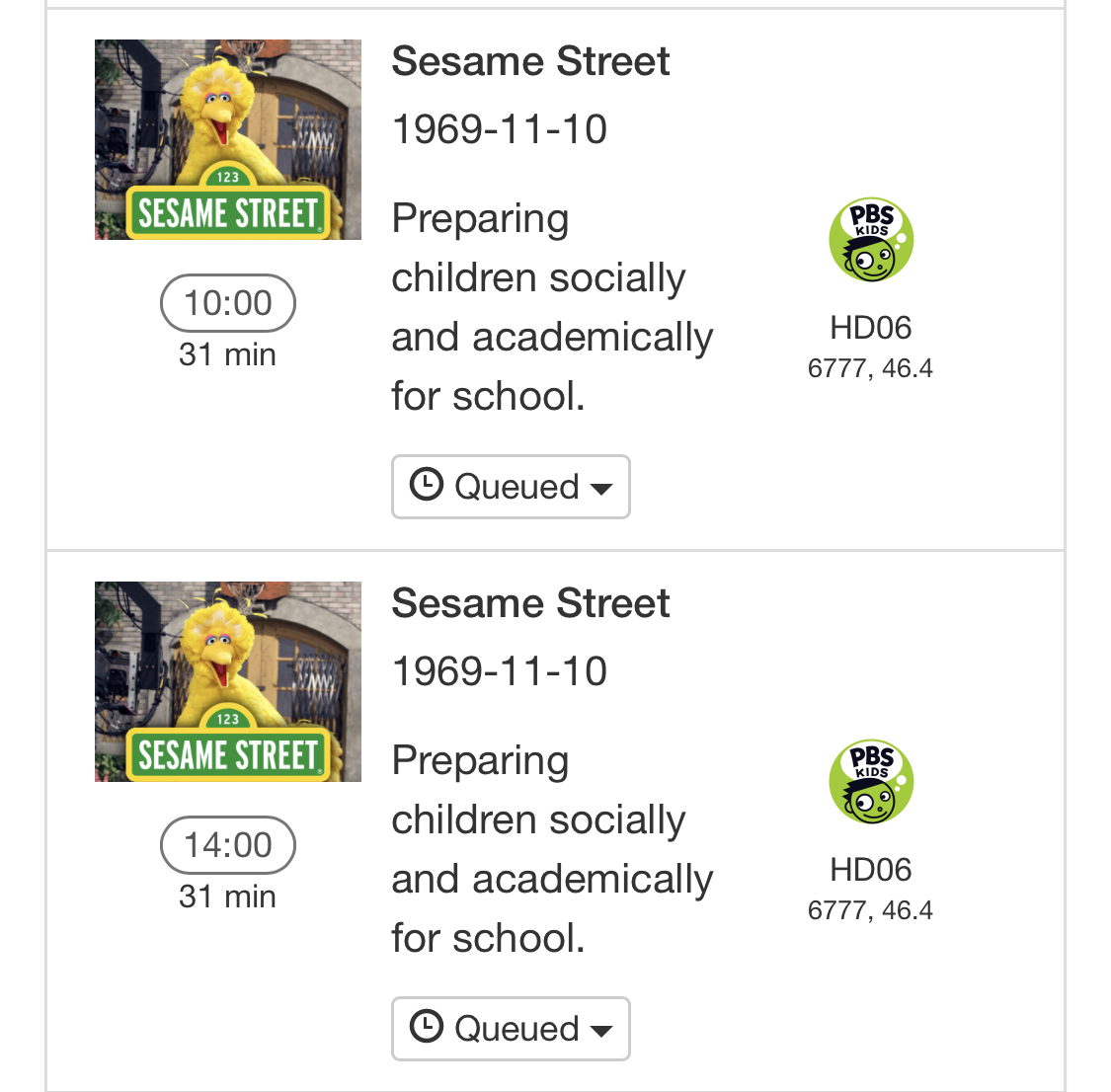 "Source":"tms","Channel":"6777","OriginalDate":"1969-11-10","Time":1585836000,"Duration":1800,"Title":"Sesame Street","Summary":"Preparing children socially and academically for school.","Image":"http://fanc.tmsimg.com/assets/p184032_b_h6_aa.jpg","Categories":["Show","Series"],"Genres":["Educational","Children"],"Tags":["CC","DVS","Stereo"],"SeriesID":"184032","ProgramID":"SH000037860000-1585836000","TeamIDs":null,"SeasonNumber":0,"EpisodeNumber":0,"Directors":null,"Cast":["Fran Brill","Leslie Carrara-Rudolph","Ryan Dillon"],"Raw":{"startTime":"2020-04-02T14:00Z","endTime":"2020-04-02T14:30Z","duration":30,"channels":["6777"],"stationId":"31780","qualifiers":["CC","DVS","Stereo"],"ratings":[{"body":"USA Parental Rating","code":"TVY"}],"program":{"tmsId":"SH000037860000","rootId":"184032","seriesId":"184032","entityType":"Show","subType":"Series","title":"Sesame Street","titleLang":"en","releaseYear":1969,"releaseDate":"1969-11-10","origAirDate":"1969-11-10","descriptionLang":"en","shortDescription":"Preparing children socially and academically for school.","longDescription":"A longtime favorite of children and adults, and a staple of PBS, "Sesame Street" bridges many cultural and educational gaps with a fun program. Big Bird leads a cast of characters teaching children numbers, colors and the alphabet. Bert and Ernie, Oscar the Grouch and Grover are just a few of the other creatures involved in this show, set on a city street full of valuable learning opportunities.","topCast":["Fran Brill","Leslie Carrara-Rudolph","Ryan Dillon"],"genres":["Educational","Children"],"preferredImage":{"uri":"http://fanc.tmsimg.com/assets/p17509689_b_h6_ac.jpg","height":"540","width":"720","primary":"true","category":"Banner-L1","text":"yes","tier":"Season"}}}},"UpdatedAt":1585187956581},{"ID":"1585850400-28","Name":"Sesame Street","Time":1585850400,"Duration":1810,"Channels":["6777","46.4"],"Channel":"","DeviceID":"","RuleID":"28","Serial":1585187953,"FileID":"","Skipped":false,"Failed":false,"Error":"","Airing":