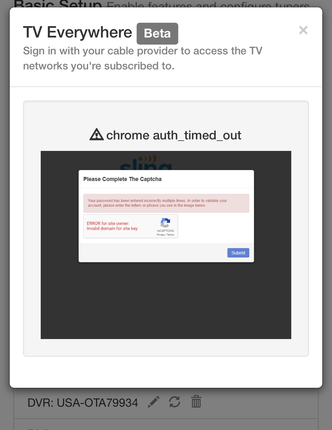 It appears I entered the wrong password a couple times and now won’t log in to scan the channels. The source is asking TV. I get a screen saying to confirm some letters or numbers but it is not visible Error for site owner.