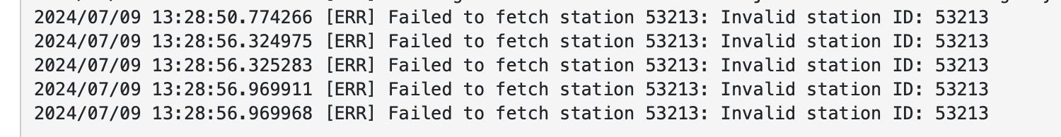 Error in log: [ERR] Failed to fetch station 53213: Invalid station ID: 53213
