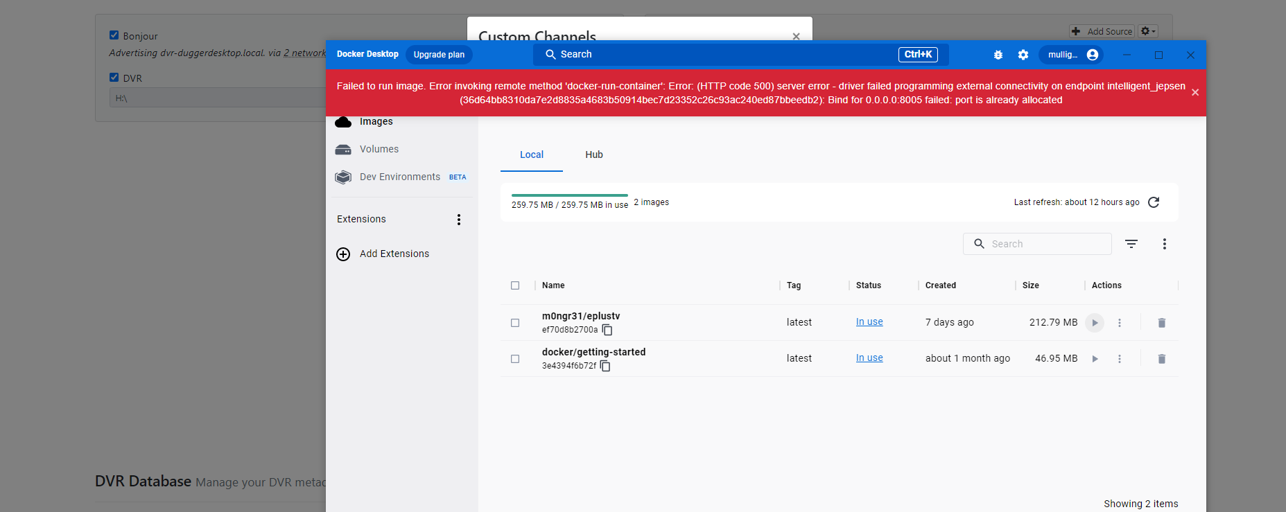 If the docker is running on the same machine as the channels server then your ip is correct. As you know the port for the docker defaults to 8000. You really only need to change this if you have something else using port 8000. The error message is telling you you can’t set up the docker to use port 8005 because you already have another program using that port. If I were you I’d leave it at 8000.