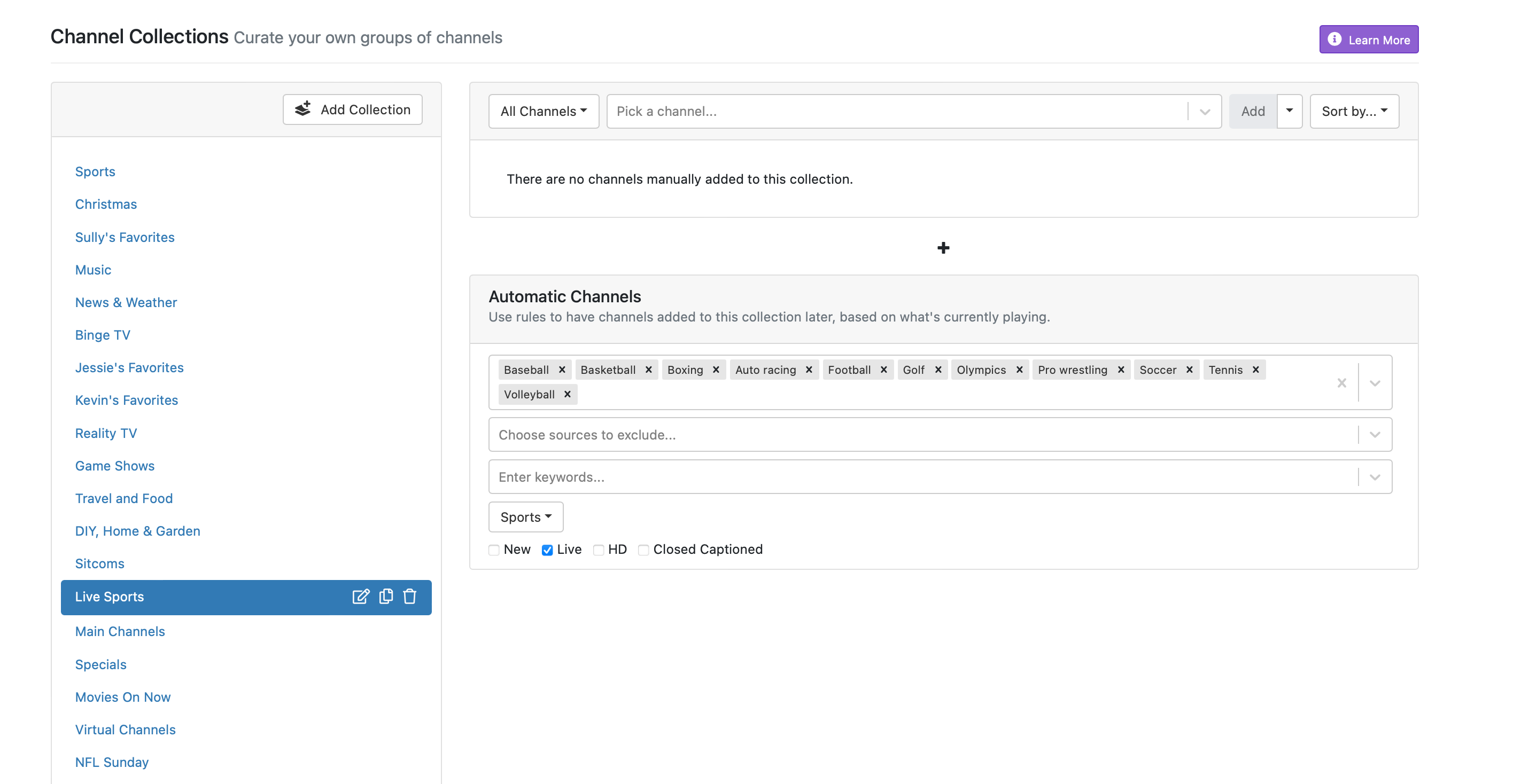 Notice there are not channels manually added. This means if there are no programs that match my live sports criteria then there will not be any content present in this collection. Depending on time of day and what sport is in season there could be none or hundreds of channels to choose from.