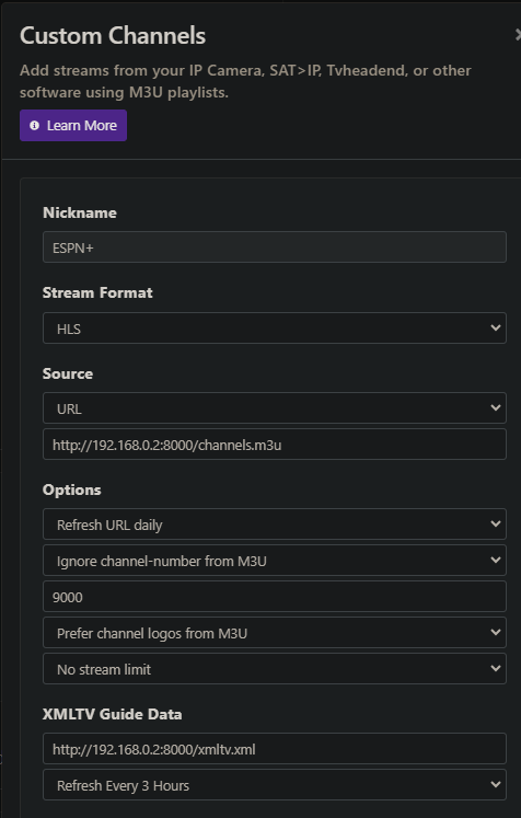 Ok was able to get it working. Had to use the local port not the container port. Problem I have now is that it shows all the channels just 1-150 and nothing else. Guide dosent show any shows till 10pm.