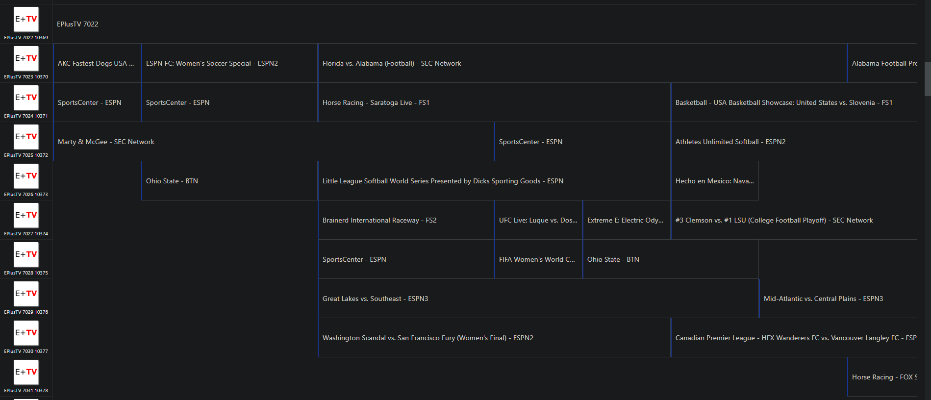 Double check your env vars. You have ESPN+ as false and another one as "ture". All the channel artwork is E+TV, which is the project name, not ESPN+. So FOX or whatever can appear on whatever channel is free at the time an event is scheduled.