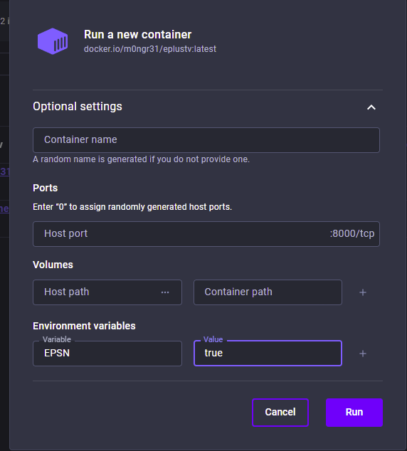 I installed windows docker and "pulled" the latest version of EPlusTV. The piece I am missing is how do I edit that command? It was an automagically load from the Docker link to the Docker desktop. Trying to wrap my head around how to breaking it out to "edit"