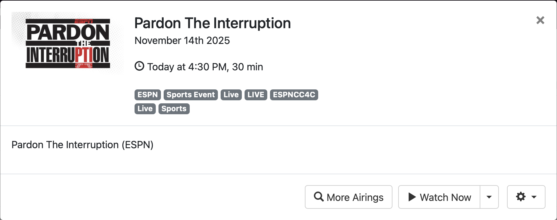 Looking at some of the events, the espn+ example has both ESPN+ and ESPN_PLUS tags. They all have three live tags: Live, LIVE, and live. The ESPN show Pardon the Interruption, should that be a "Sports Event" or is there a different tag for non-event shows?