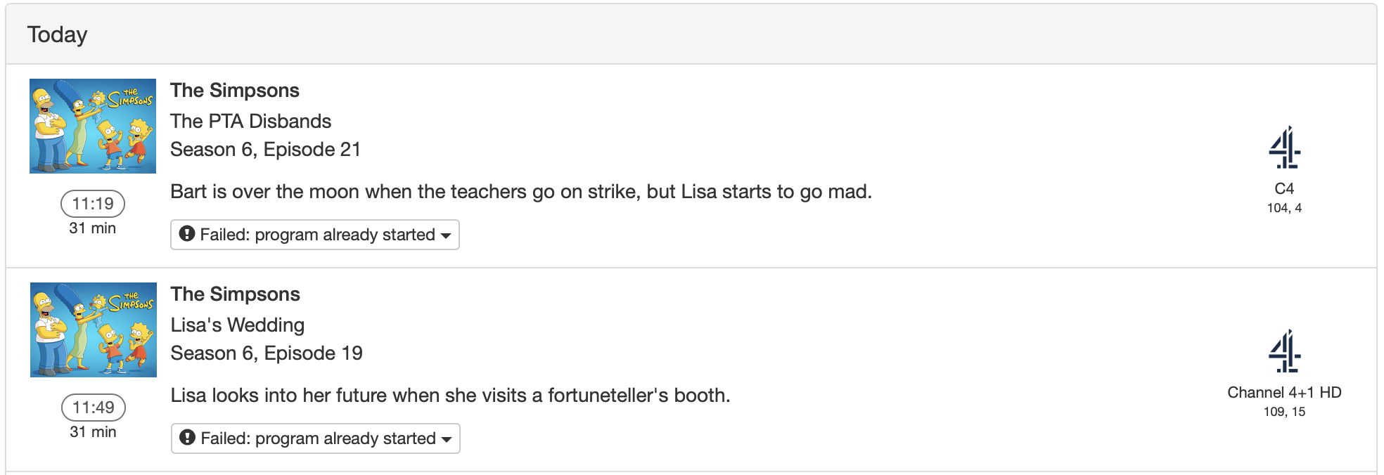 With season pass recordings in particular, I keep getting these errors. It says that the program started before the recording started even though I had a buffer set so that recording started 1 minute before the program is due to start. Screen shot below