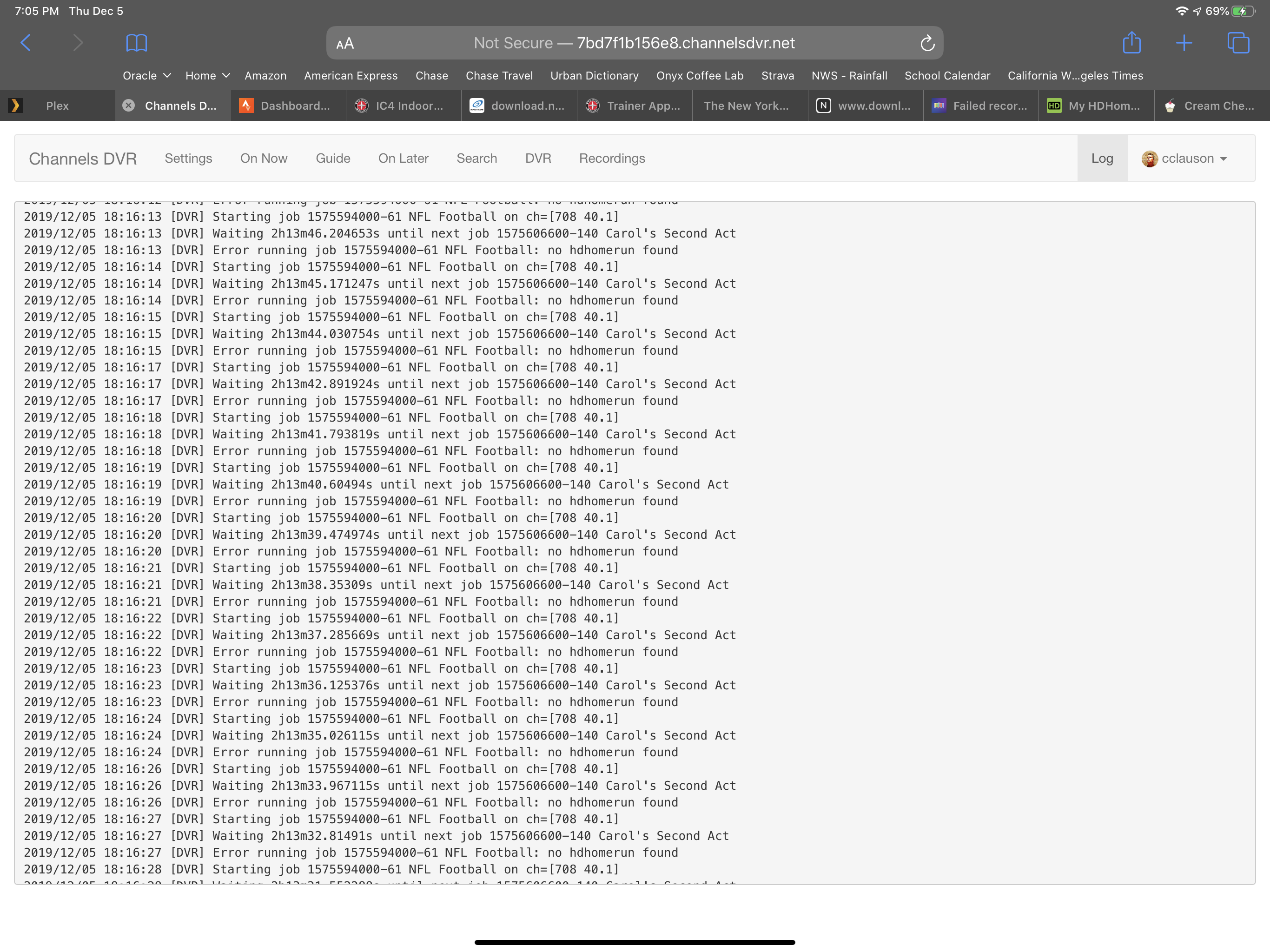 After the auto-upgrade to yesterday's stable build, the dvr came up and couldn't find any HDHRs. When this happens it checks every minute but still was unable to discover them. That caused all the failures, including the ones listed as "already started".