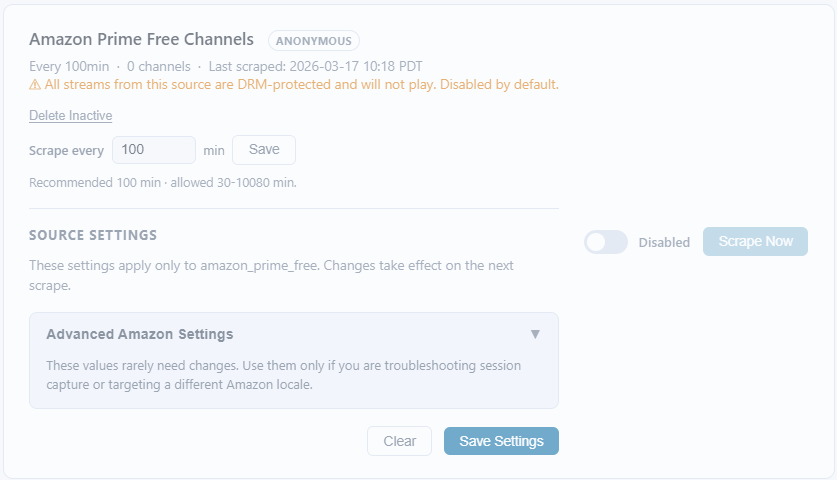 After refreshing all the sources in Fastchannels to pick up new channels, there are now a lot of enabled Amazon Channels. Because there's no "Amazon" in the dropdown for Sources, there's no apparent way to delete them en masse so I'm disabling them manually.
