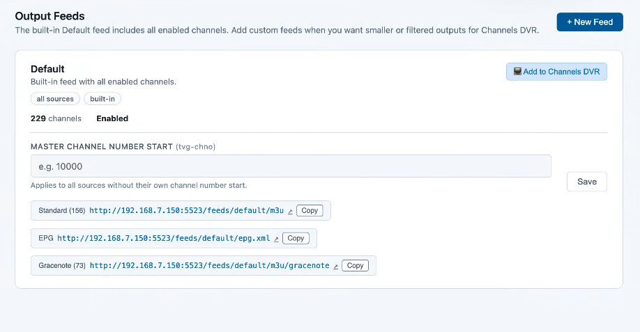 Then, I'd start fresh - back on Channels admin page, go to sources and remove the ones you made for FastChannels. Then go back to FastChannels and add your feeds and hit "Add to Channels DVR) (assuming you did step 1) and FastChannels configures ChannelsDVR automatically for you.