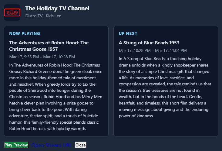 I think it’s defaulting to UTC time for almost everything. I’m messing with getting it to respect local times. But minor issue as it’s just a preview of what’s on/next. Regardless I’ll address.