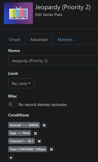 I have set up four Advanced Passes in priority order for new episodes of Jeopardy to control my preference order for station and time.