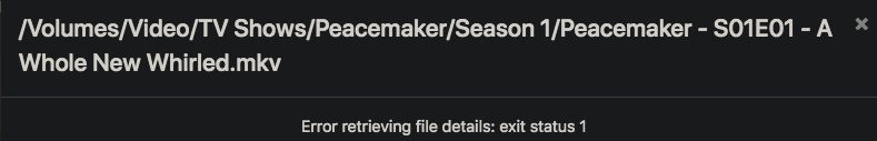 2022/10/21 10:25:15.456871 [HLS] Couldn't generate master playlist: Couldn't probe recording: /Volumes/Video/TV Shows/Peacemaker/Season 1/Peacemaker - S01E01 - A Whole New Whirled.mkv