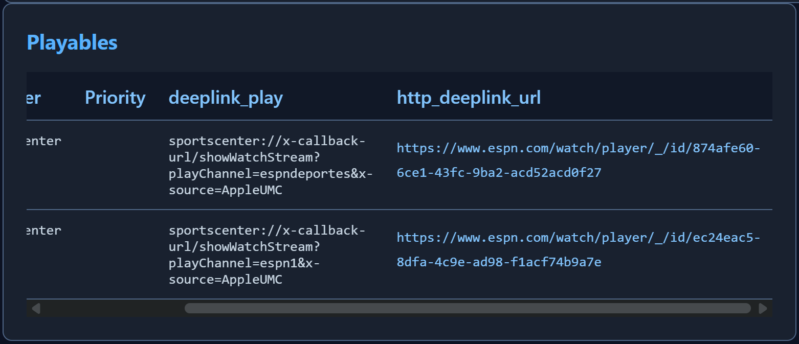 anyway, i think with those lineral events on espn4cc4c, i had to guess the URL by combining event ID and some other field. looks like Apple reports it "properly" in their eyes (and i think does work on tvOS) but must not for Fire/Android.