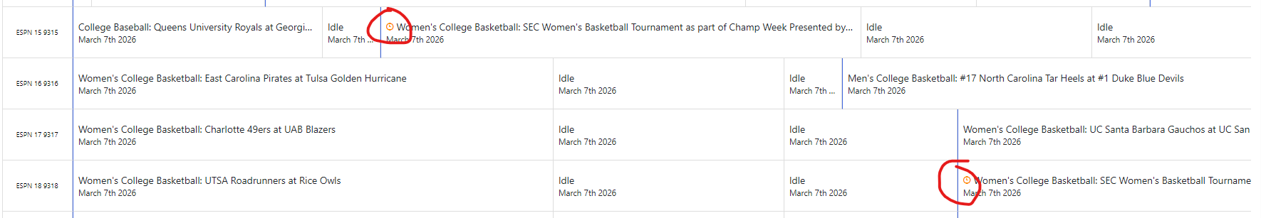 Looking back at ADBTuner, it appears there was some duplication between what I setup and what the P1C button set up which may have caused some confusion. I've blown that away and updated the M3U and TVXML for the (single, non-lanes) source. I see a bit of an issue, which is likely a guide update issue: The two semi-final SEC WBB Tournament games on Saturday are being treated by CDVR as the same event. I set one to record and the other shows it is going to be recorded (but it won't because of the dup):