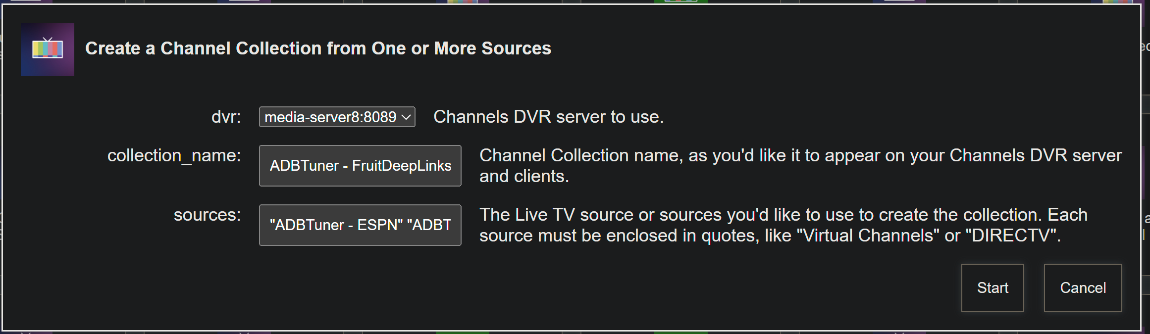 Name your collection, and add as many sources as you like, space-separated and enclosed in double quotes -- and a Channel Collection will be created.