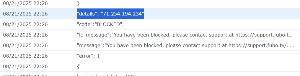 2025/08/22 07:08:02 stdout "lc_message":"You have been blocked, please contact support at https://support.fubo.tv/. If you are using a VPN service, please turn it off",