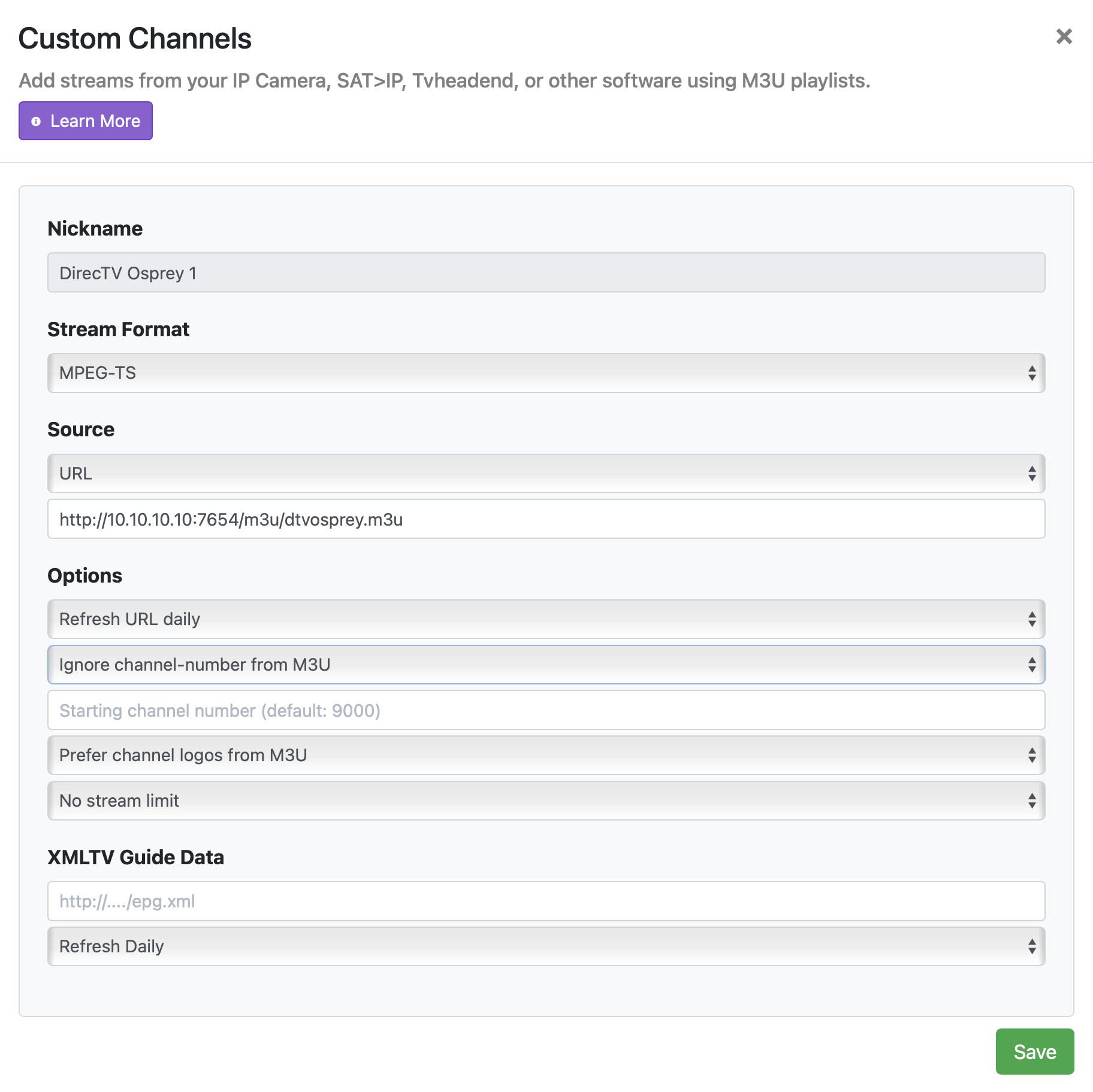 Here are two screenshots. The first is the custom channel settings. The second I added just in case. The "DirecTV Numbered" was how I read to be able to set the DirecTV channel numbers manually so I could make them like the native DirecTV channels. My family has had DirecTV since 1994 so I have them memorized