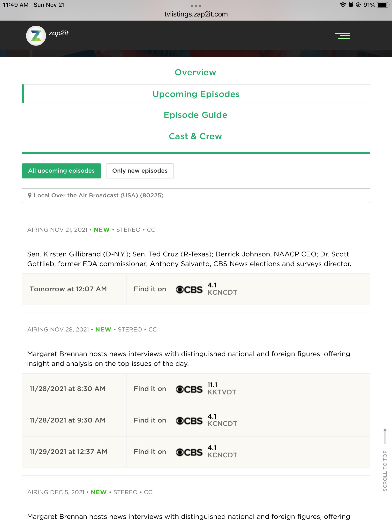 Face the Nation in the Denver market is often split into two segments. Yesterday, Channels DVR showed such a split. This morning, the previously scheduled Sunday 9:30AM recording never happened. Zap2it show now shows a single segment scheduled later overnight and my Channels DVR local guide matches.