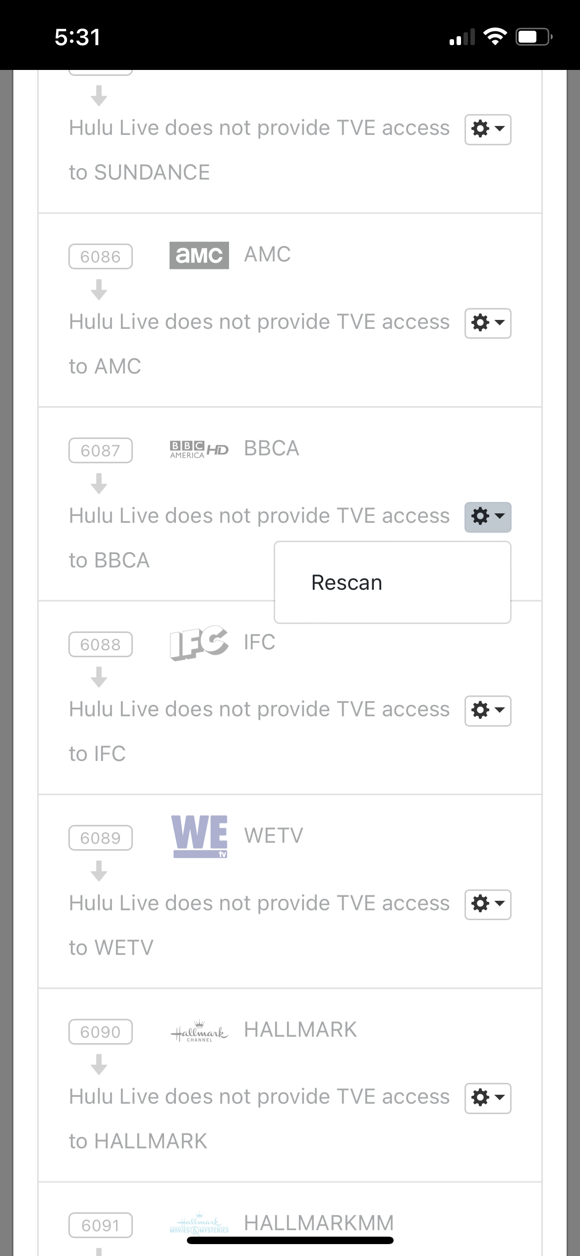 What we are saying is they are always there. You just have to hit the scan button for them to show up so you can hit rescan on them. I got to this screen by hitting manage lineup then scan. As you can see bbca shows up to scan even though Hulu doesn’t even support bbca