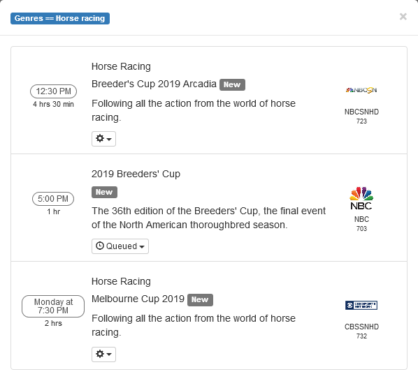 I have horse racing set to record, buy it always doesn't. For example I have the Breeders cup Arcadia scheduled on NBC Sports, because the tag underneath says Horse racing, but 2019 Breeders cup on NBC isn't set because the tag says 2019 Breeders cup. Can this be corrected or it's a guide data issue?