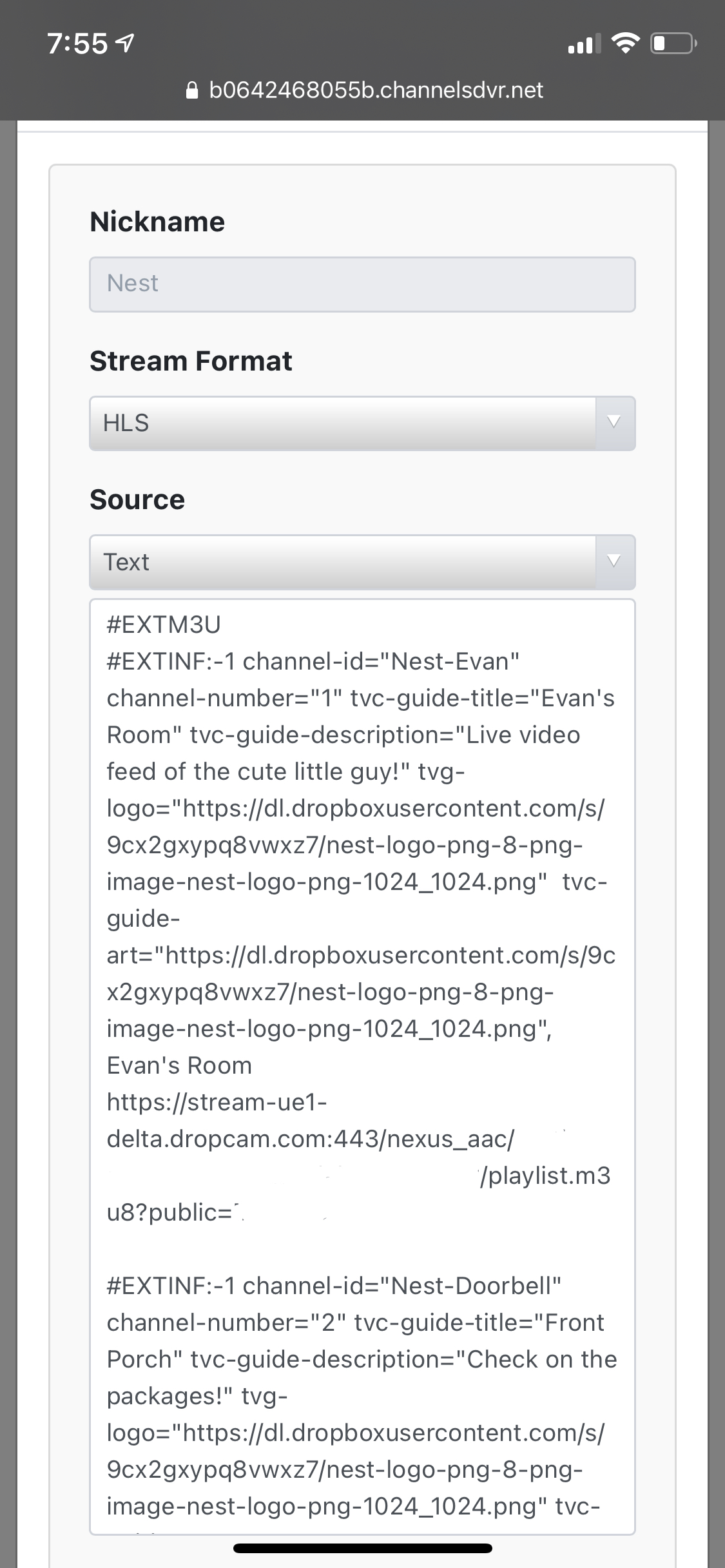 You have to grab the .m3u file from the Nest web app. Unfortunately, I had to enable a public link which I wasn’t super excited about but it was worth the risk to me. From the Nest settings on the web (not available in the mobile app) enable the public link. Then, launch the public link and search through the browser inspector to to find the .m3u link. Once you find it, setup the custom channel like below.