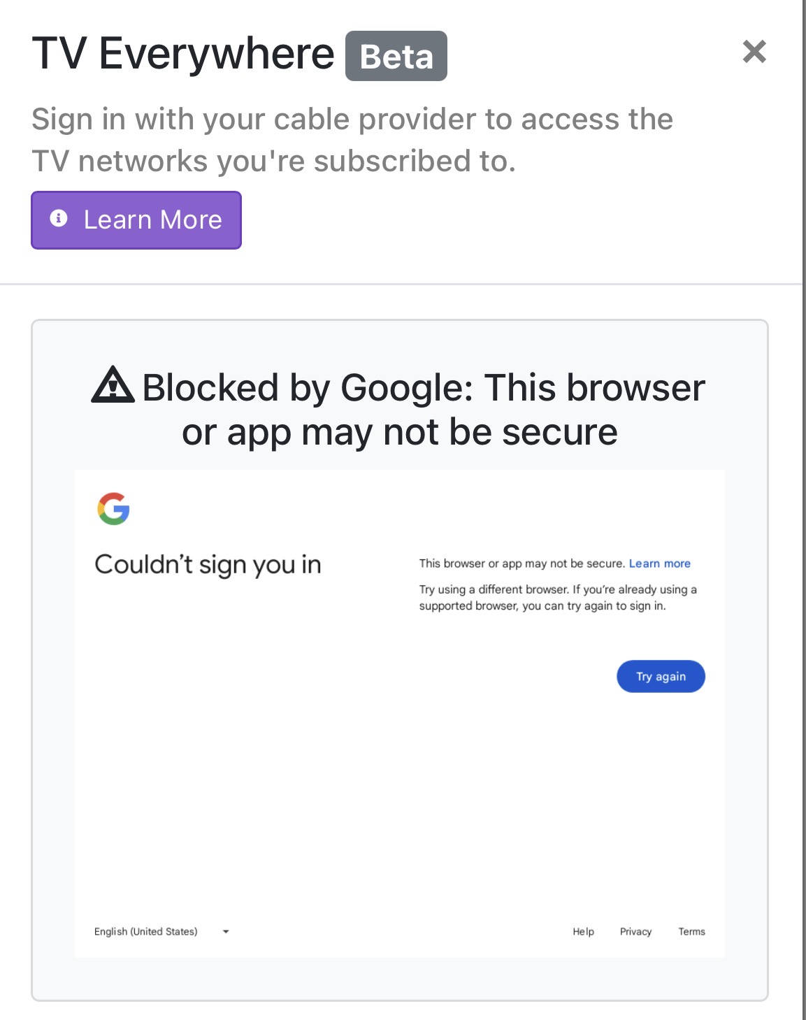 I setup a new gmail. No 2FA of any kind. Did not set backup email or phone, nothing. Added that account to my YouTube TV family. I’m using those credentials to sign into TVE via ChannelsDVR running on Synology. I have tried from a Windows PC both on chrome and Edge, MacBook Pro, iPhone, iPad, and all of them get hit with the incompatibility error about the browser. It will not get past that screen no matter what I try.