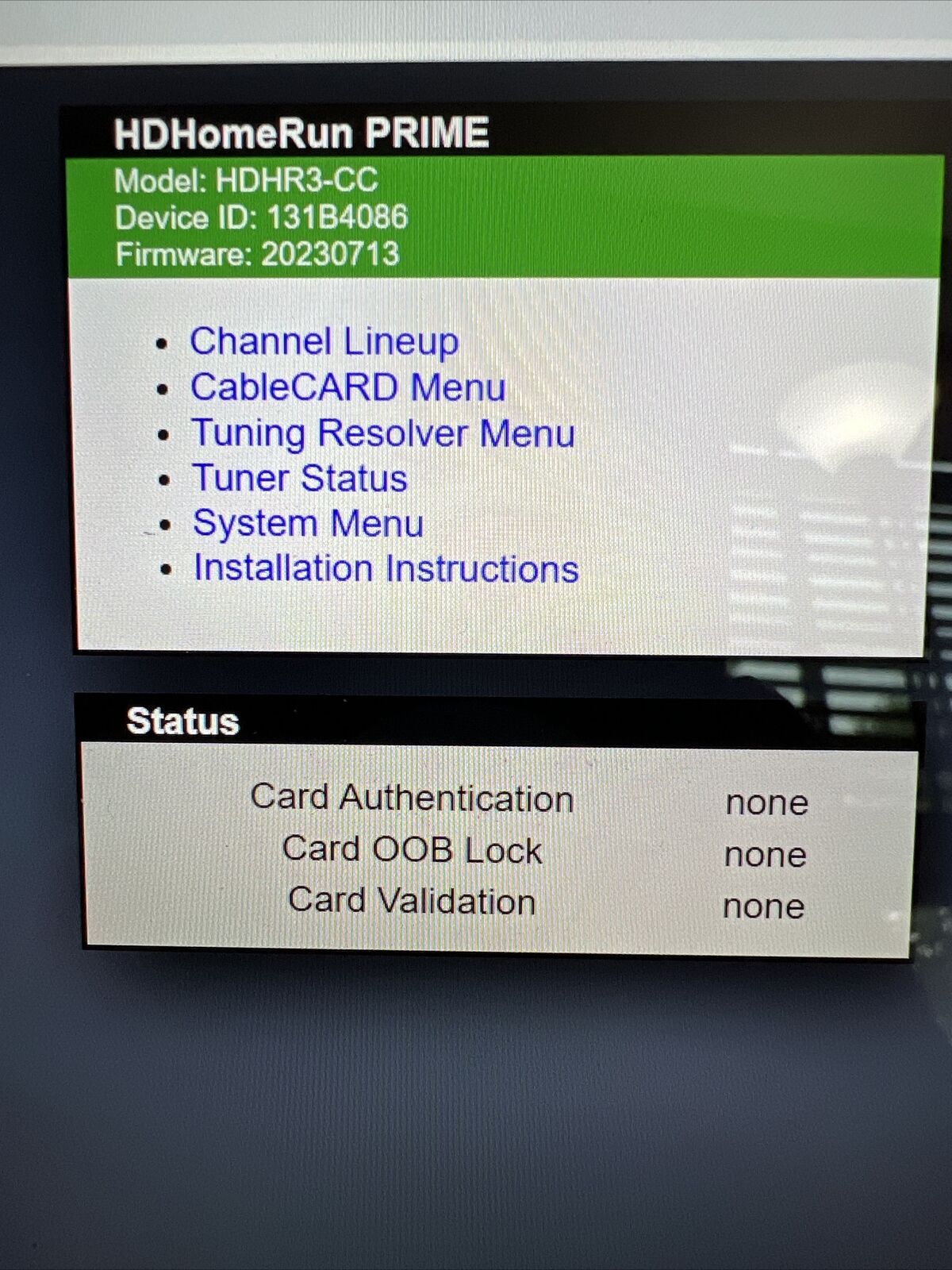 I thought that with my cards activated, the HD Homerun Windows app I could watch TV on the PC and just tinker BUT I have no channels. The app sees both of my 'Primes' but when I click 'channels' it does nothing after changing to the SCAN. Here's some misc captures. The note on one where it shows 'status' as 'STANDBY' confuses me.