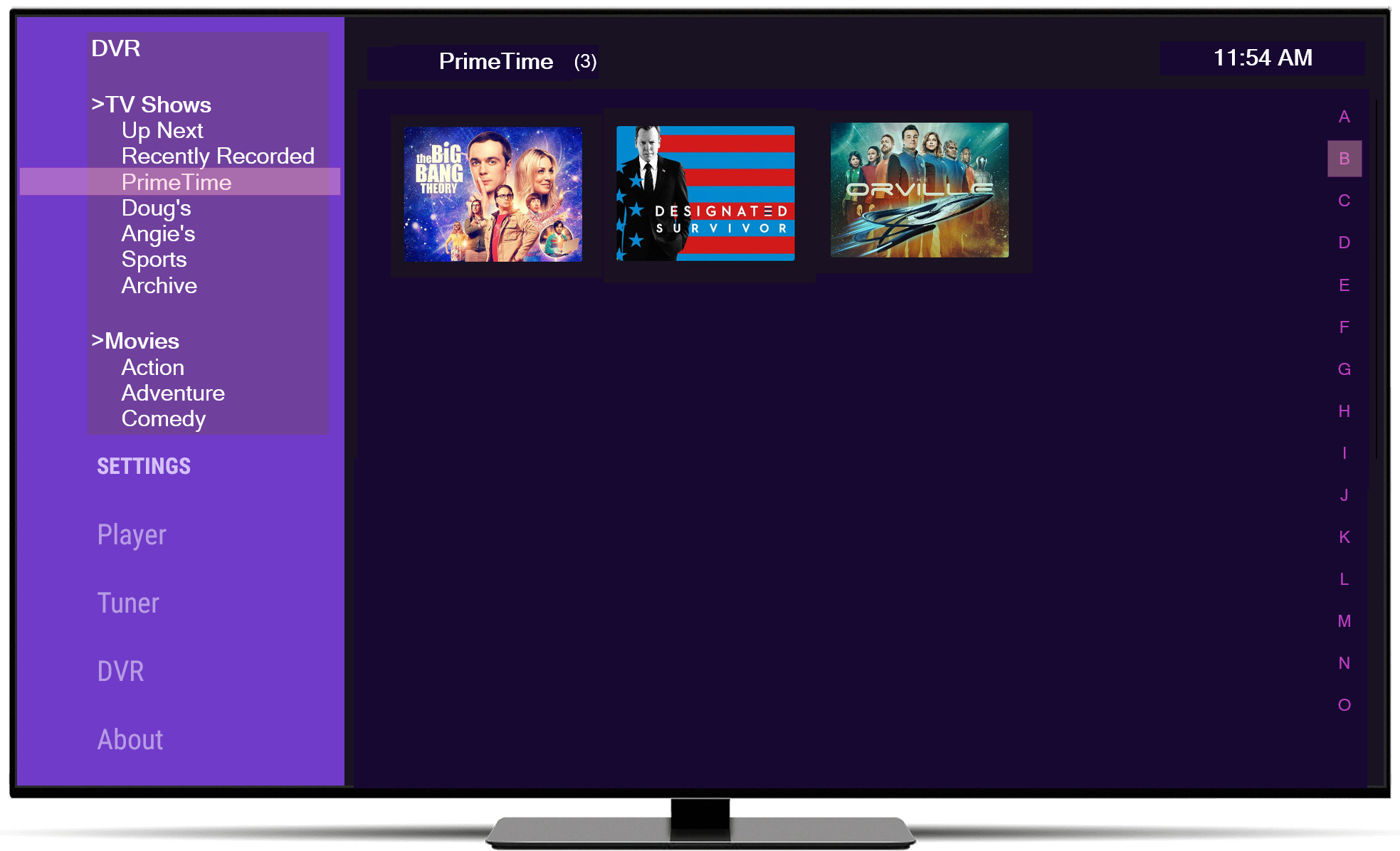 Once a custom tag has been applied to a TV Show either automatically during the season pass settings, or manually on a per-show basis, it would then automatically filter recorded content based on these Tags. Moreover, it would make it easier for users to access all TV Shows. For example, there would be a new Main Category under DVR that just says “TV Shows”. Highlighting that option immediately lists all TV shows without any filters. Clicking on that heading however, would reveal a nested section that shows the “Up Next”, “Recently Recorded” and any additional Custom Tags the user has created. Here are a few examples.