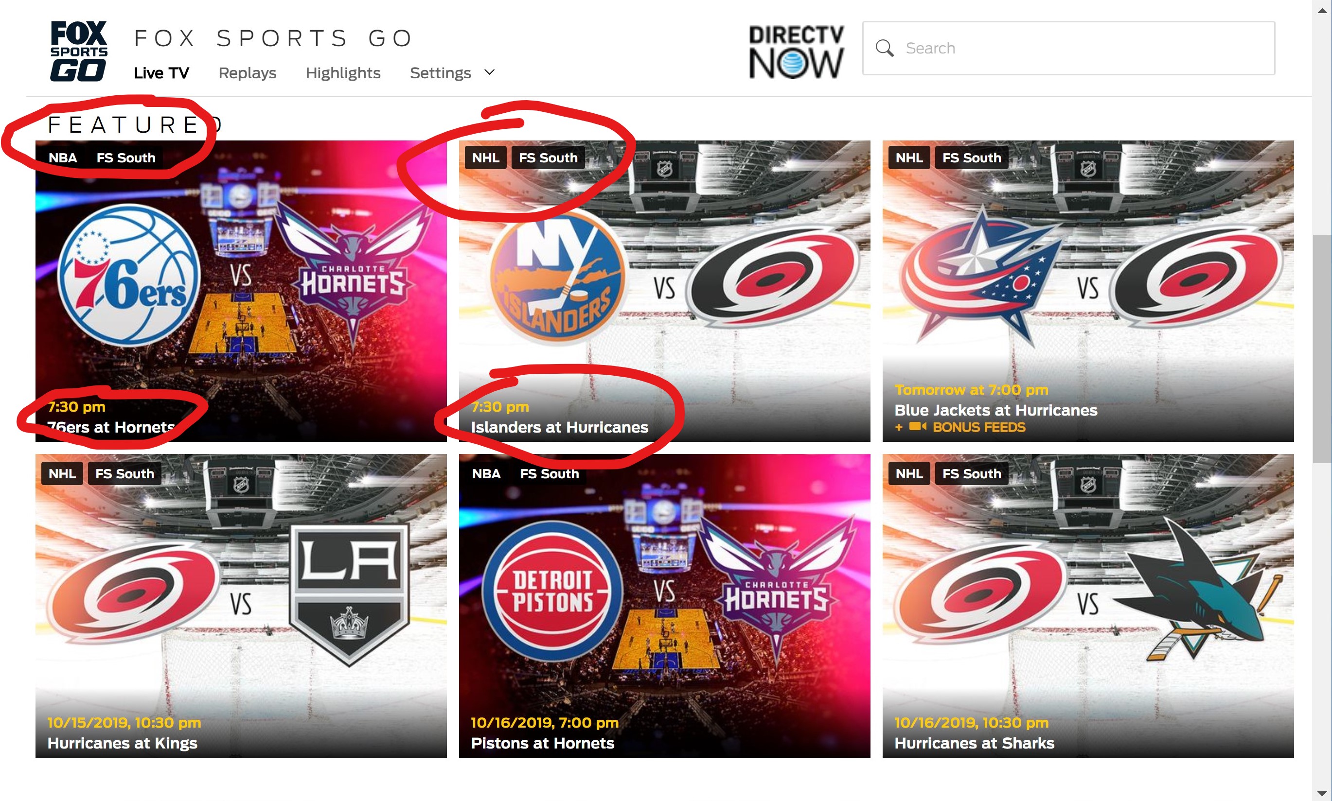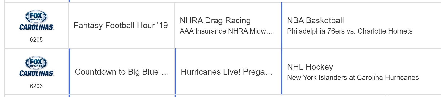 Shows Fantasy Football Hour on FS South. I don't see Fox Sports Carolinas. I see Fox Sports Carolinas programming but it's listed as being on Fox Sports South... e.g. the Carolina Hurricanes game is on at 7:30 but the website shows "FS South" on the preview pic.