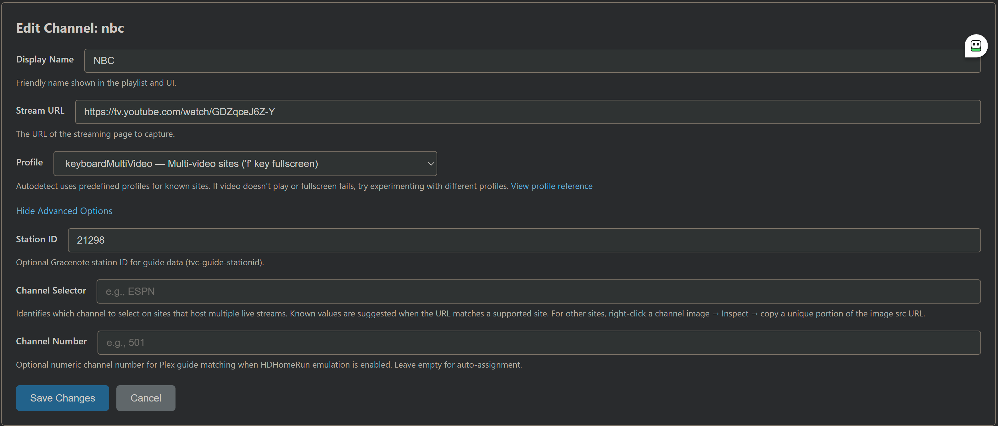 I updated from the 1.1.0 bnhf docker to the current one and it appears to be working well with YTTV, however, before I knew better, I attempted to override abc with the YTTV URL that I use with ADBTuner; I disabled, then re-enabled the channel to attempt to restore it and now it seems like all other channels tune properly except this one - when tuning, it actually appears to tune the proper ABC channel, then it re-tunes to the local FOX affilliate - is there a way to reset the channel settings to the default, or do I have to clean house and re-install the docker?
