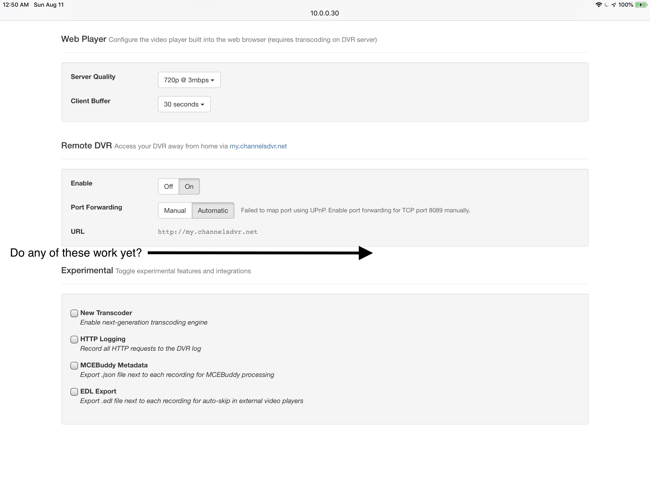 As a reminder: this is experimental because it may have bugs that cause it to not work right, including causing playback to stop or the DVR server to stop responding to requests.