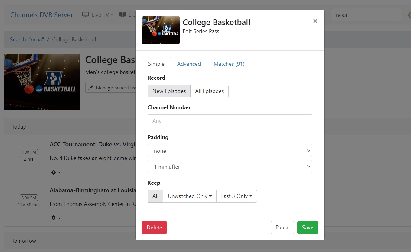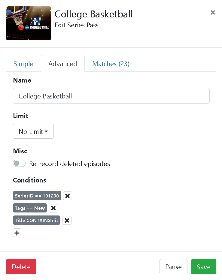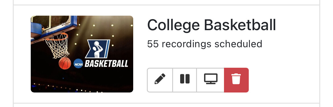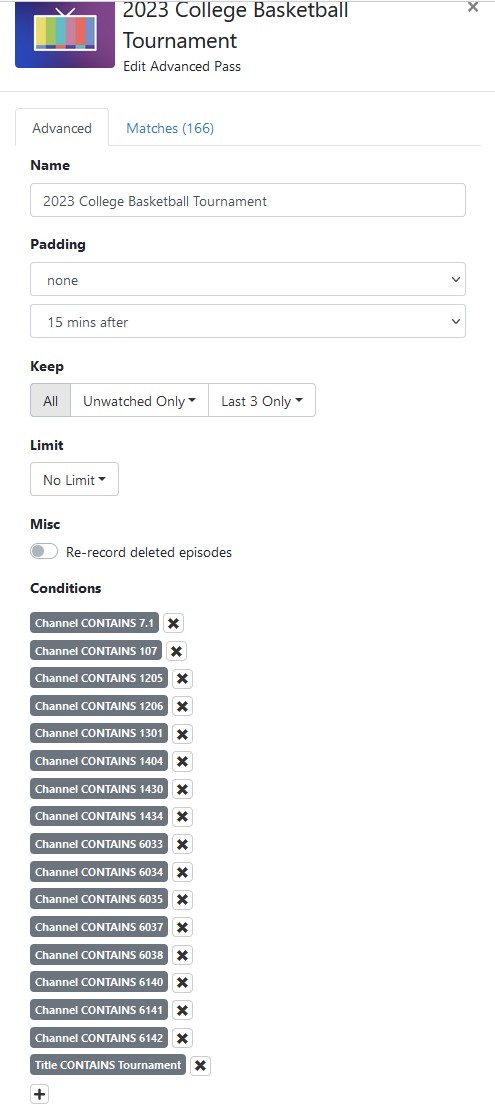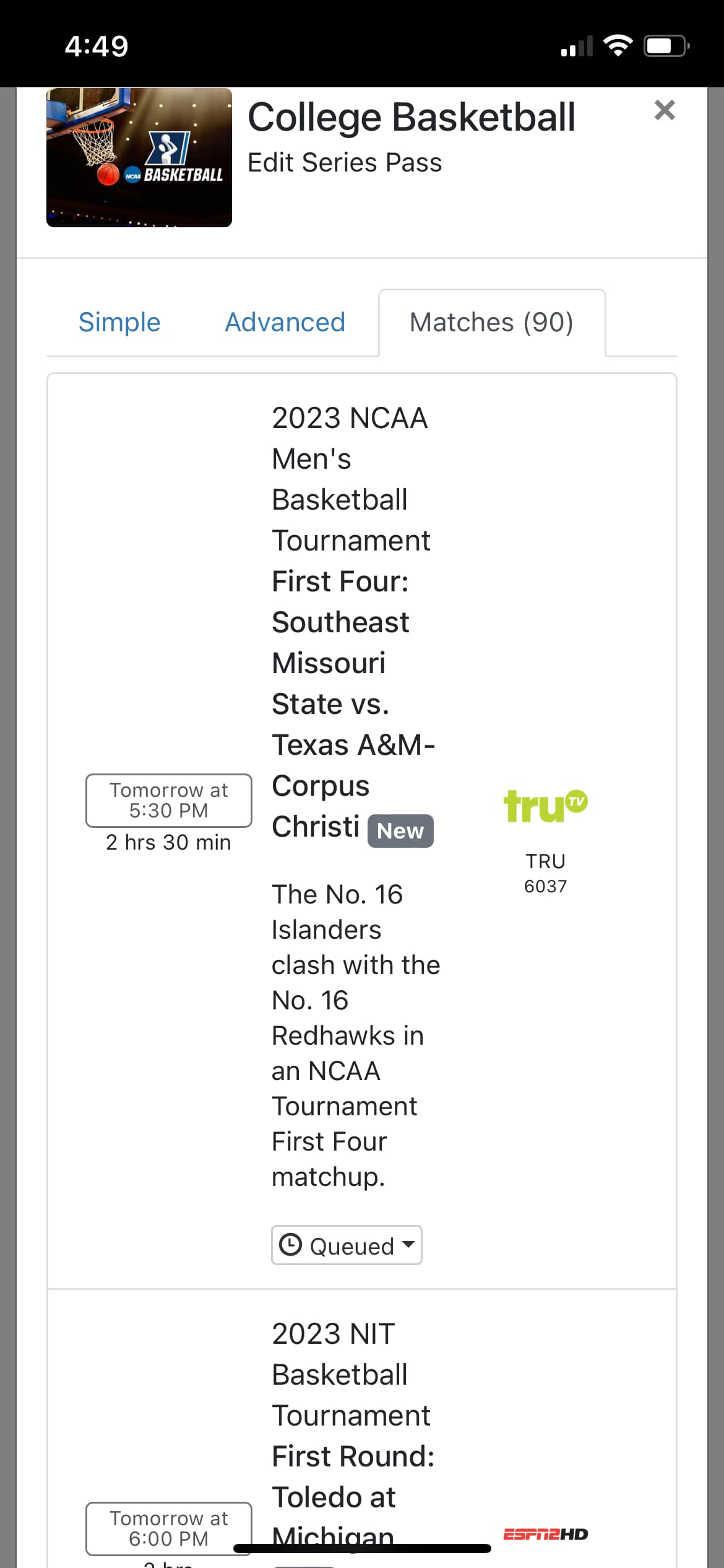I'm used to being able to record all the games of the NCAA's March Madness and the NIT tournament (Men's and Women's) back when I was using WMC and our TiVos, but I'm getting worried. I have tried to create a pass that would record all the first round games of the NIT tomorrow and Wednesday and only one game shows up in the schedule, titled, "2023 NIT Basketball Tournament; First Round: Teams TBA" at 4 pm (Pacific) on ESPN2HD. When I go to the guide, every first round game says "2023 NIT Basketball Tournament; First Round Teams TBA" and shows that it is "Queued" with no option to record it separately. There is only one entry with this title in all of my scheduled recordings.