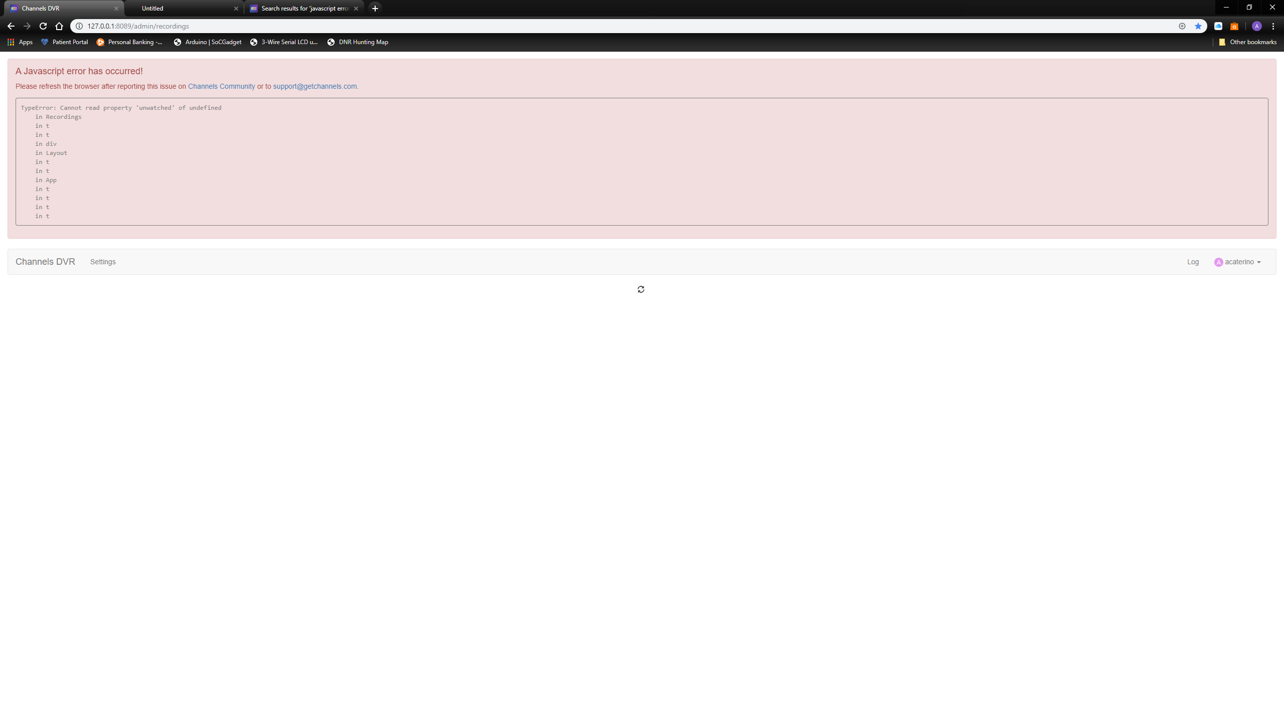 The bookmark in the browser was set to go to the recordings tab and since the DVR feature was disabled, that is when I got the javascript error. When going to the settings tab with you link I was able to turn the DVR function back on. Better error handling would be appreciated.