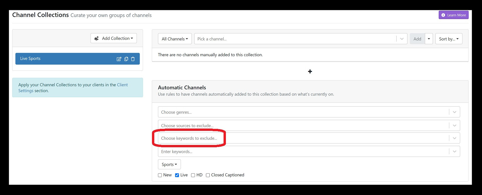 Does the creation of Channel Collections in Channels DVR allow me to exclude keywords? Such as, I want a Channel Collection for sports but I want it to exclude any programs containing the keyword "Golf" in its description. If not, then could it be added as an option? Here's a visual example of what I'm after: