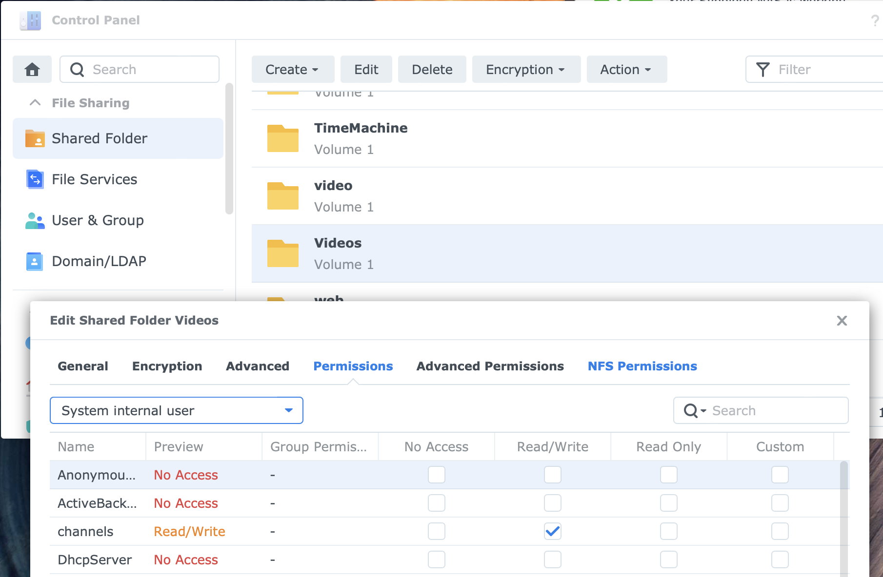 Hi, I run channels on a Synology NAS. I have created a Videos Folder as follows: