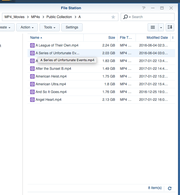 pic 3 - contents of folder named "A". folder "A" is representative of all my other folders, in that there are no further nested folders, only the movie files themselves.