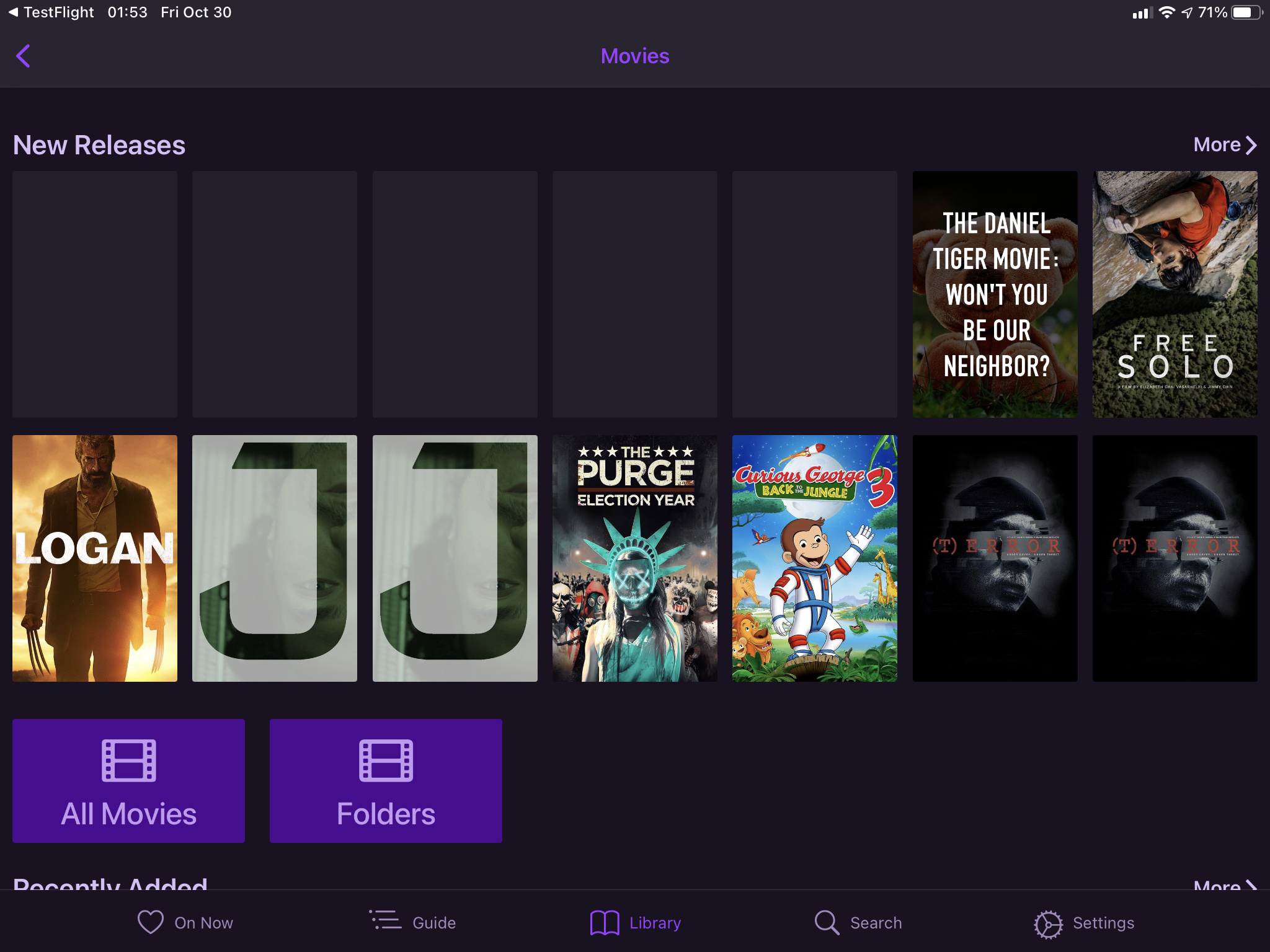 the app will sometimes present blank icons, and other times it will harvest cover art that does not reflect the name of any existent movie file, but instead cover art for random movies that reflect the user created name(s) of the folders in my Local Content directory. you can see this behavior in pic 3 where the app is displaying two movies icons for some movie titled "J" that does not exist in my library and two icons for a movie titled "T" which also doesn't appear in my library.
