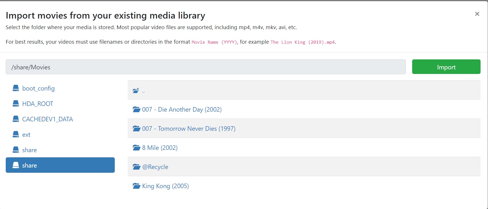 As there are no sub-directories under each movie title [e.g. King Kong (2005)], when I choose any of these directories in the picker, it shows an empty set as I expect. I am; however, able to open each of these directories within the picker, which suggests to me that the application has permission to read.