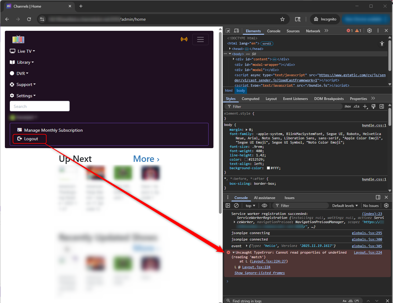 I manage two CDVR subscriptions and sometime in the past year or so I lost the ability to logout via the CDVR web admin page. I have to do it via community.getchannels.com instead? Because this menu option is inoperable for me: