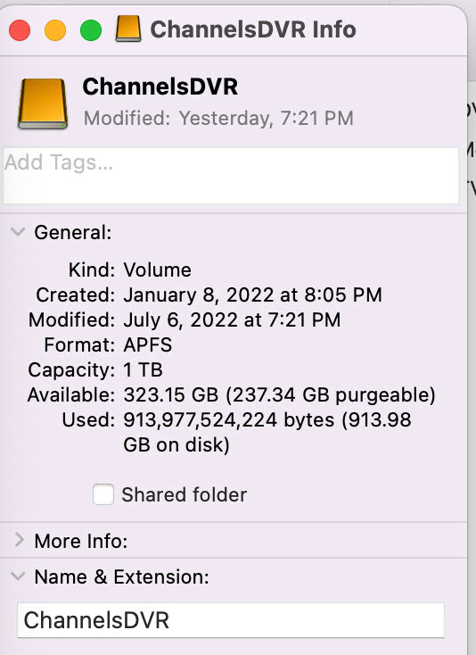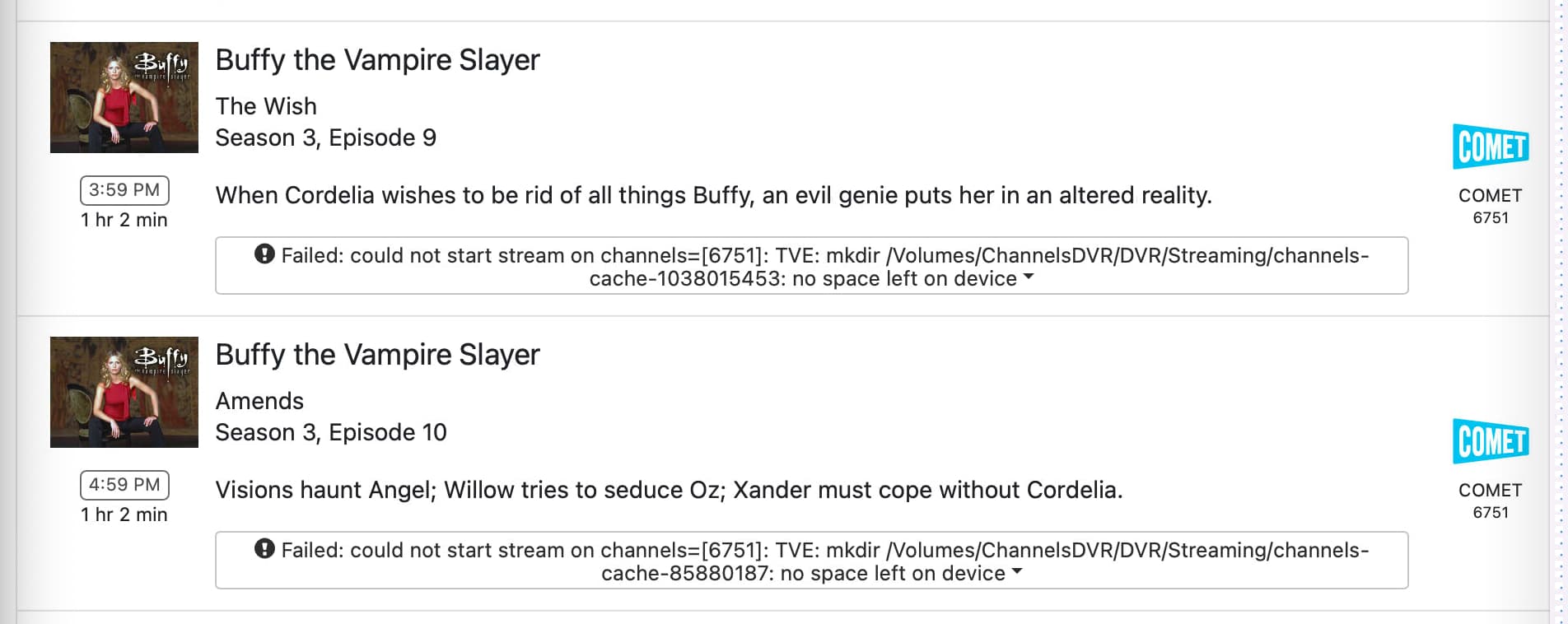 My analysis is that there is plenty of space available, but Channels is not querying the file system for the 'correct" version of available space, and needs to be updated to handle this, uh, quirk, of APFS. Either query the "real" amount of available space, or, when the amount of available space looks like it's low, force a purge, then re-query how much space is available.
