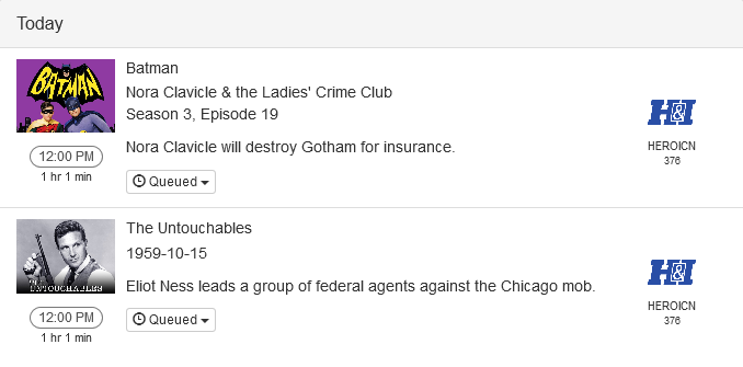 I also setup a series pass for the show, the original 1959 The Untouchables, all 4 Seasons, 118 episodes, 8 episodes airing each Sunday on H&I (Heroes and Icons).