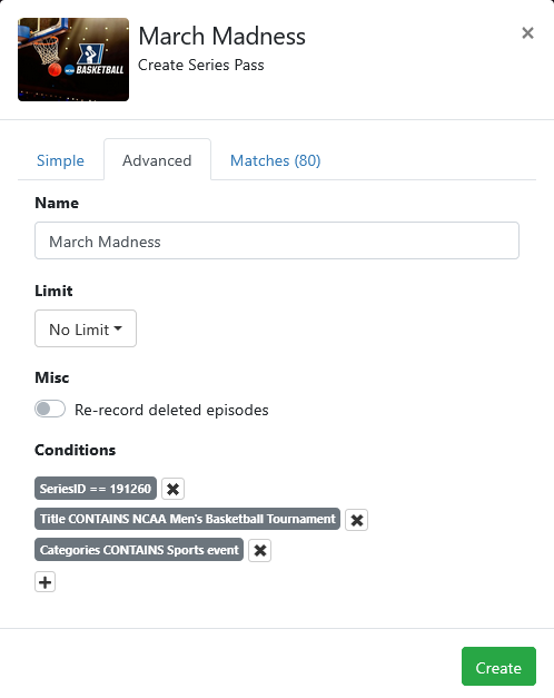 I've tried setting up an Advanced Pass for "2026 NCAA Men's Basketball Tournament" with the four channels and with Tag contains "Playoffs" and "Basketball" and a couple other things and have gotten no matches.