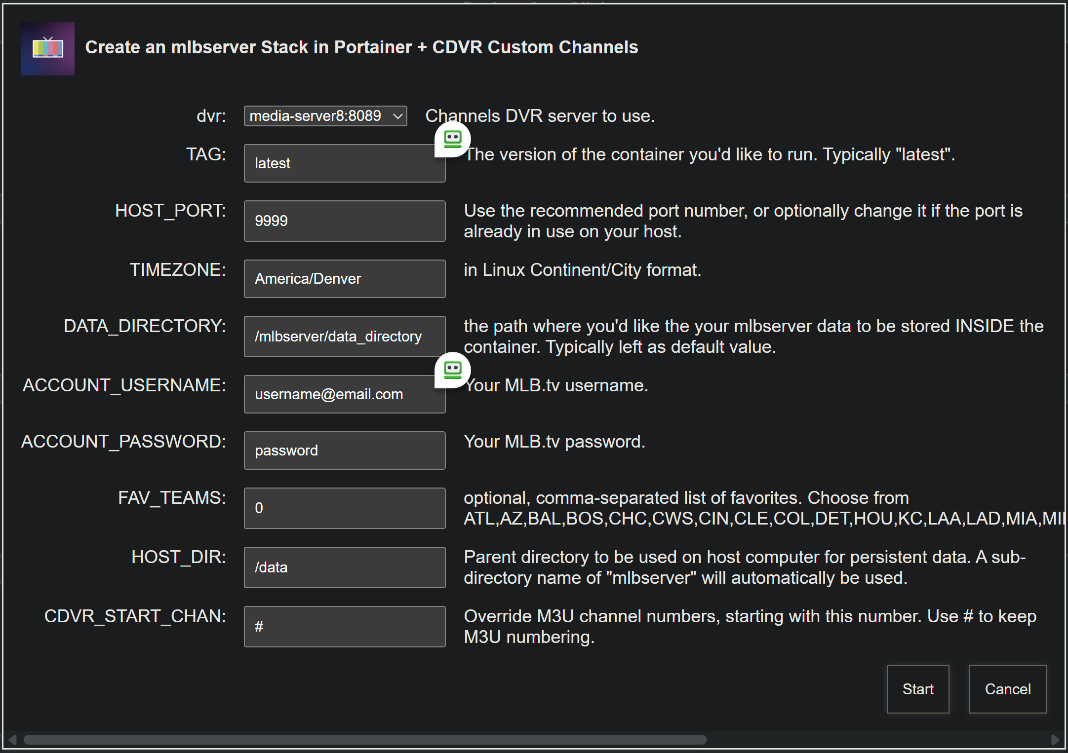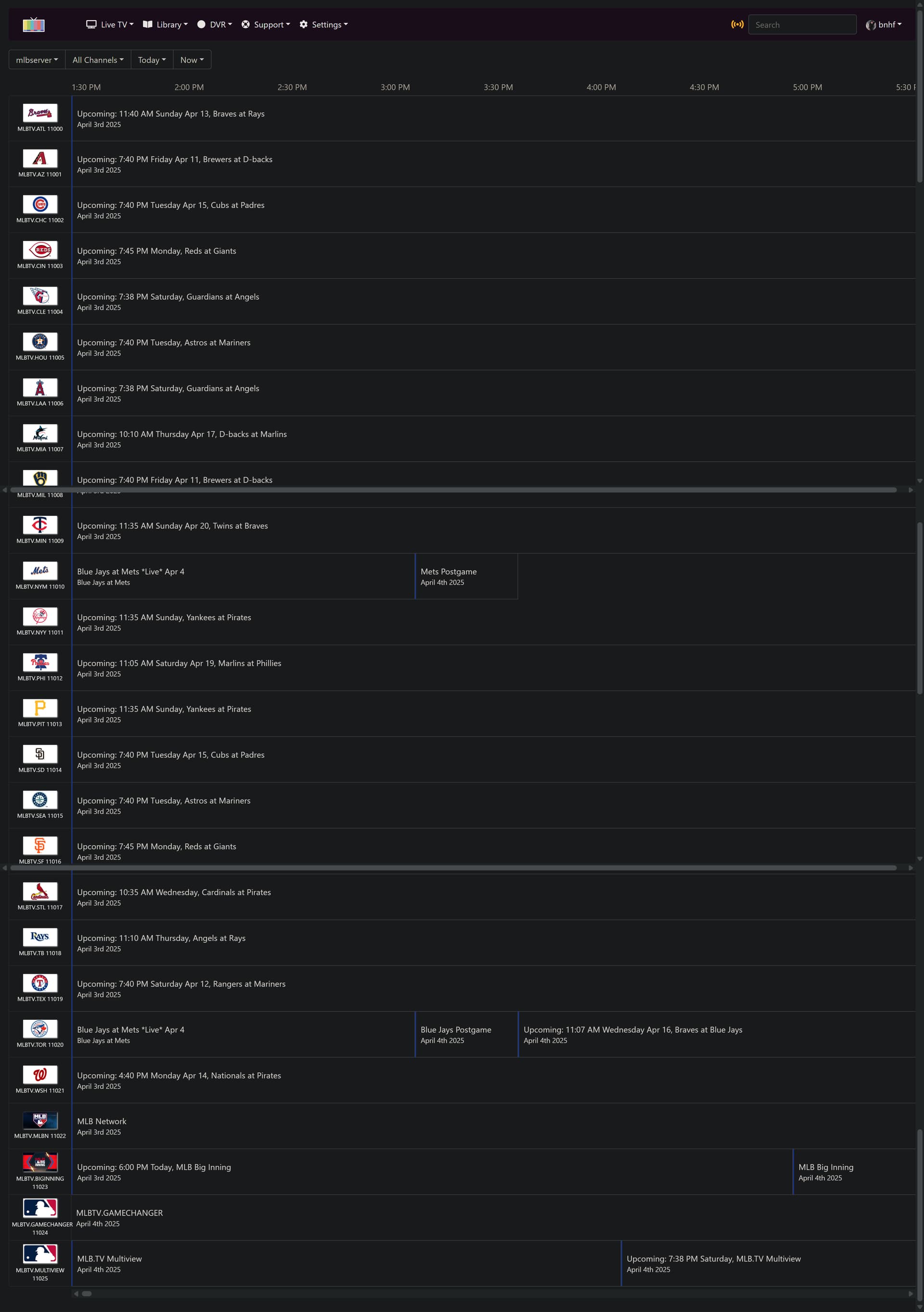 I was originally going to containerize this and offer it via docker pull so my script contains fake m3u streams, basically dummy channels along with the xmltv guide data allowing the container to be added into channels. Once in to channels it could easily assigned to your mlb server channels.