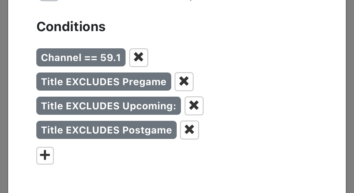 @tonywagner On your next update can I suggest that you remove the live, new, and other tags from the upcoming blocks. When creating an advanced pass for live gamesl it would make one less excluded setting to make. Personally I’d also like to see those new and live tags removed from the pre and post game blocks while leaving the other baseball, sports, and sports event tags in place. This would simplify the pass making process to channel number and a live tag for just the game and if you want the pass to cover the game and pre and post the pass could include a channel and a sports tag to cover recording those three programs. Less settings in a pass means less chance of something breaking down the road.