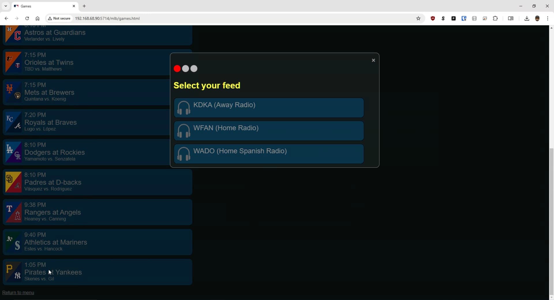 Finally, in this plugin's web interface if I choose the live stream it just shows a black screen with the time line moving (like if there is just audio playing and no video) and if I go to Today's Games and select a live Yankee or Met game and get the screen to select which feed to play, I only see radio feeds to choose from and none of the TV ones.